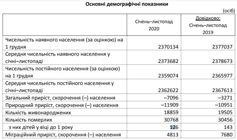 Натомість ще більше скоротилася народжуваність – за цей період в Україні народилося 268,9 тисяч дітей, що на 6,2% менше, ніж за аналогічний період 2019 року. Згідно з даними Держстату, в цілому населення України на 1 грудня 2020 року оцінювалося у 41 млн 629,93 тисяч осіб, що на 292,74 тисяч, або на 0,7% менше, ніж роком раніше.