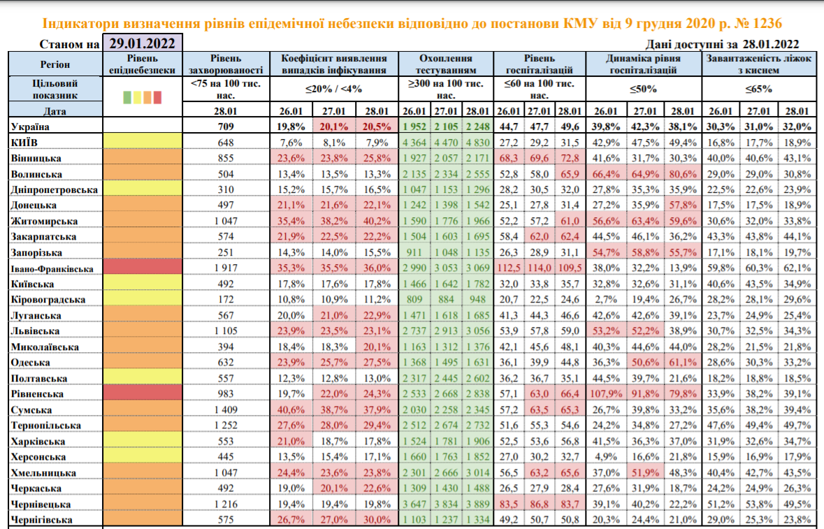 Коефіцієнт виявлення випадків інфікування в Україні за даними за 28 січня становить 20,5% за норми 20%. Він також перевищено у 15 областях України. Найвищий коефіцієнт зафіксовано у Житомирській (40,2%), Сумській (37,9%) та Івано-Франківській (36,0%) областях.