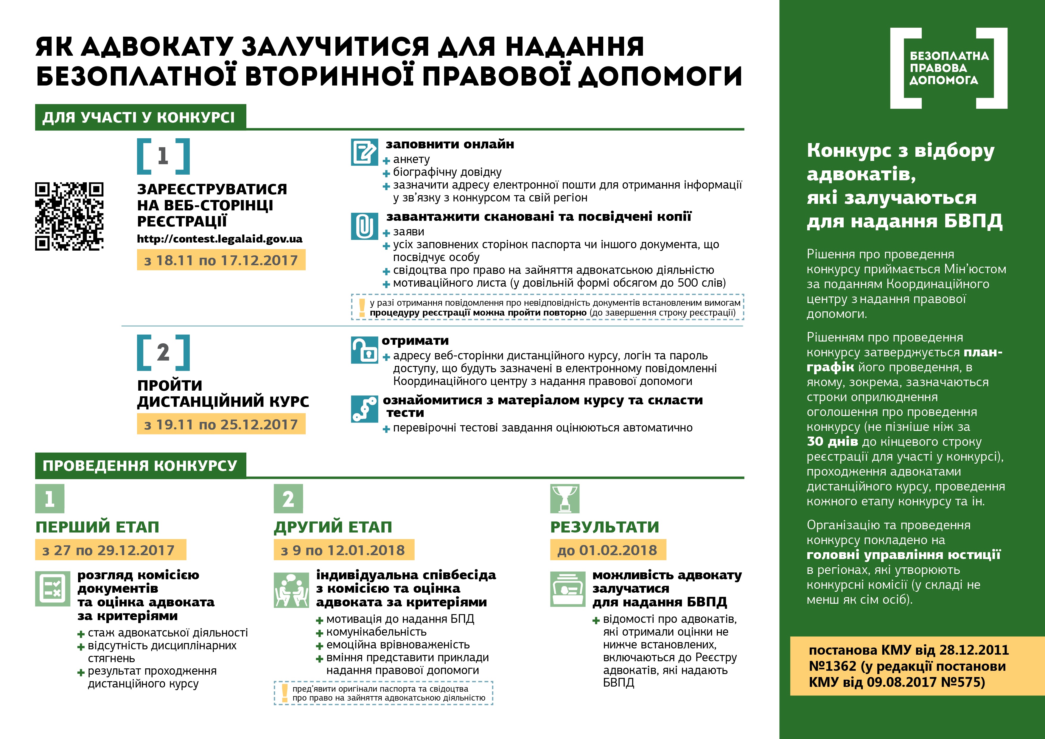 Відповідно до наказу Міністерства юстиції України від 13.11.2017 № 4300/7 «Про проведення конкурсу з відбору адвокатів, які залучаються для надання безоплатної вторинної правової допомоги» Координаційний центр з надання правової допомоги повідомляє про проведення з 18 листопада 2017 року по 23 січня 2018 року конкурсу з відбору адвокатів, які залучаються для надання безоплатної вторинної правової допомоги (далі – конкурс).