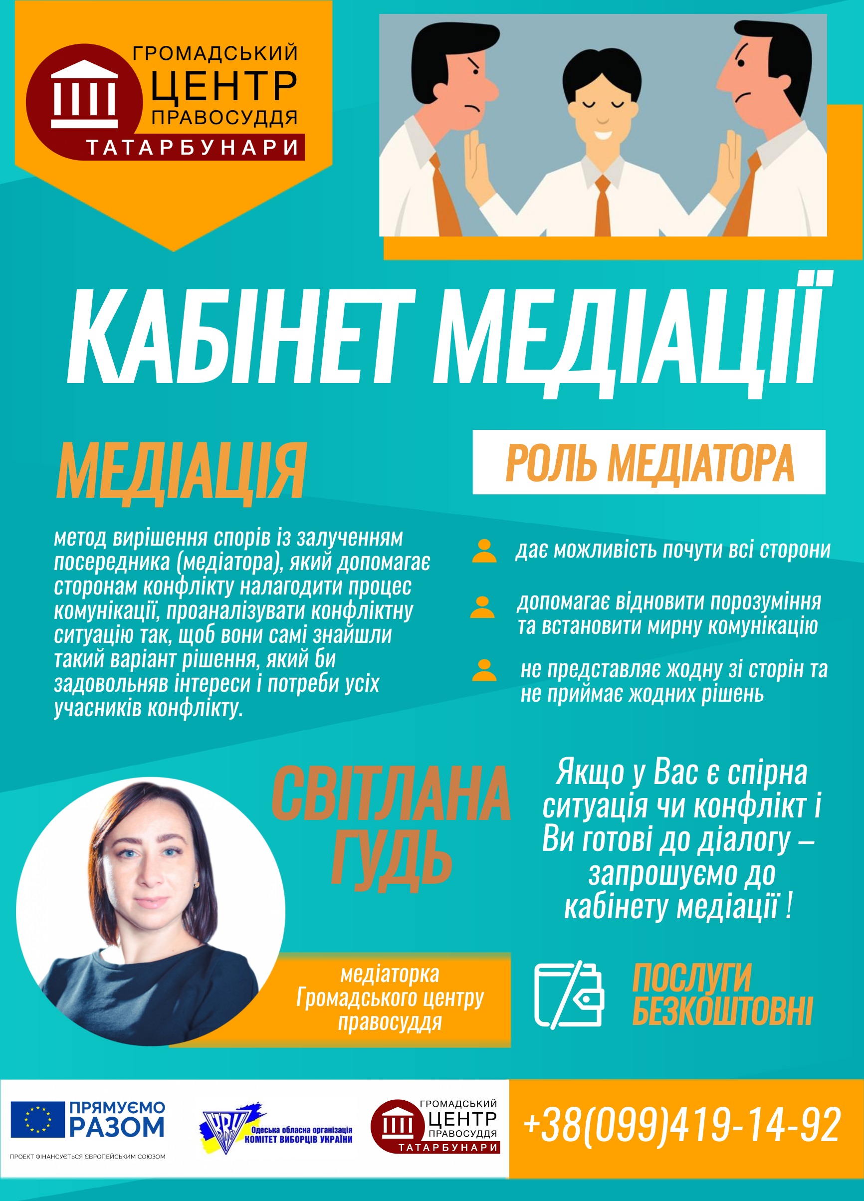 Якщо у Вас є спірна ситуація чи конфлікт і Ви готові до діалогу – запрошуємо до кабінету медіації Громадського центру правосуддя в м. Татарбунари. Медіаторка Центру Світлана Гудь на постійній основі надає безоплатні послуги з медіації в м. Ізмаїлі та м. Татарбунари, а також на виїздах в інших населених пунктах південних районів Одеської області. В умовах пандемії та впровадження карантинних обмежень, Громадський центр правосуддя в м. Татарбунари надає також психологічну допомогу вразливим категоріям людей – зокрема, жінкам та дітям з питань домашнього насильства.
