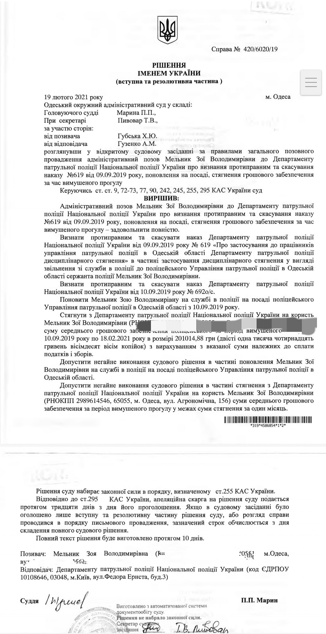 "Одеський Окружний адміністративний суд визнав протиправним і незаконним наказ Департаменту патрульної поліції про моє звільнення і постановив негайно відновити на службі. В управлінні патрульної поліції не змогли довести мої "численні запізнення" і "прогули", бо їх не було. Так само серед "доказів" не було жодної скарги на мене від громадян", - зазначила вона.