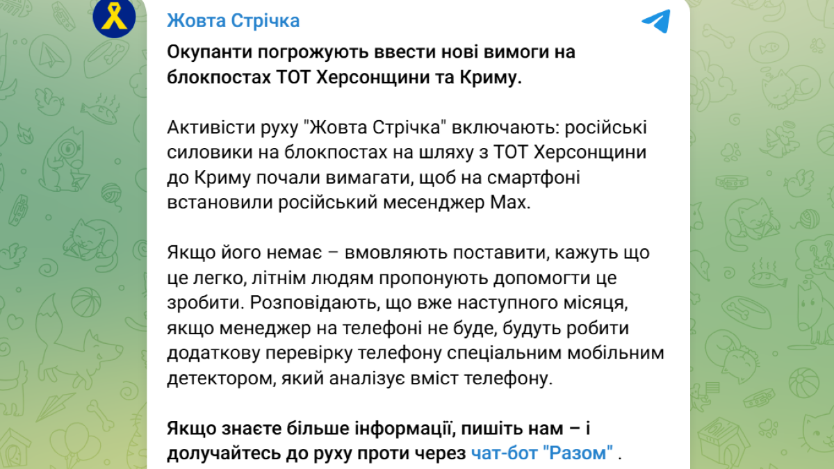 Окупанти на блокпостах між ТОТ Херсонщини та Кримом змушують людей встановлювати на телефони державний месенджер росії. Відсутність програми загрожує додатковою перевіркою вмісту смартфона спеціальним детектором уже наступного місяця.