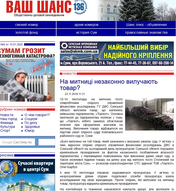 12-13 листопада 2016 року слідчі ГУ ДФС у Сумській області провели обшук на митному пості «Столичний» Київської митниці, у ході якого було вилучено 9 контейнерів з тканиною компанії «Торгест». За даними слідства, при декларуванні цих тканин службові особи «Торгест» внесли завідомо неправдиві відомості щодо класифікації товару, його ваги та фактичної вартості, наслідком чого є ненадходження в бюджет митних платежів в значних сумах.