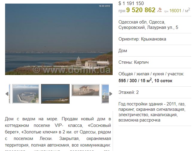 Зазначимо, що котеджні селища "Золоті ключі" та "Сосновий берег", до яких мають безпосереднє відношення деякі із зазначених вище фірм, знаходяться на морському узбережжі під Одесою та продаються за елітними цінами.