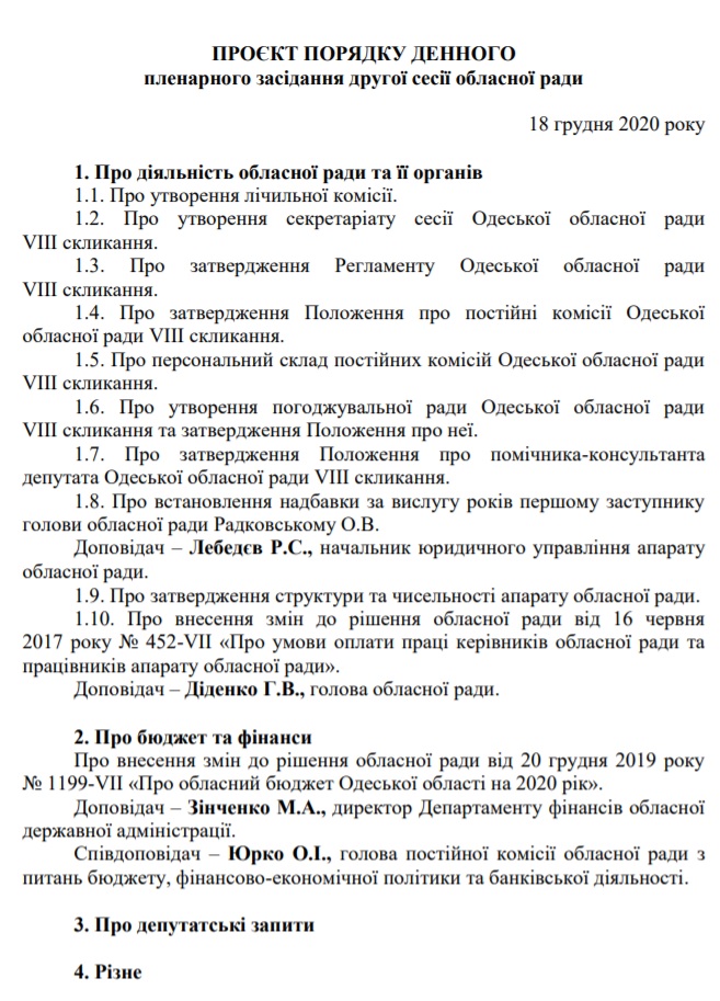 • утворення секретаріату сесії Одеської обласної ради VІІІ скликання.