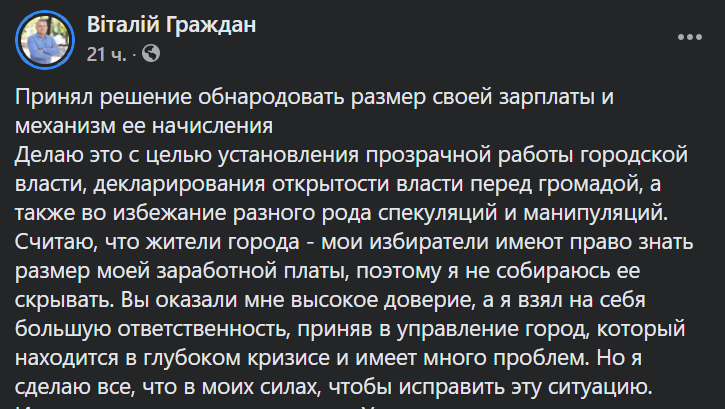 Також у повідомленні зазначено: «Згідно із законодавством України зарплата міського голови формується з декількох складових.