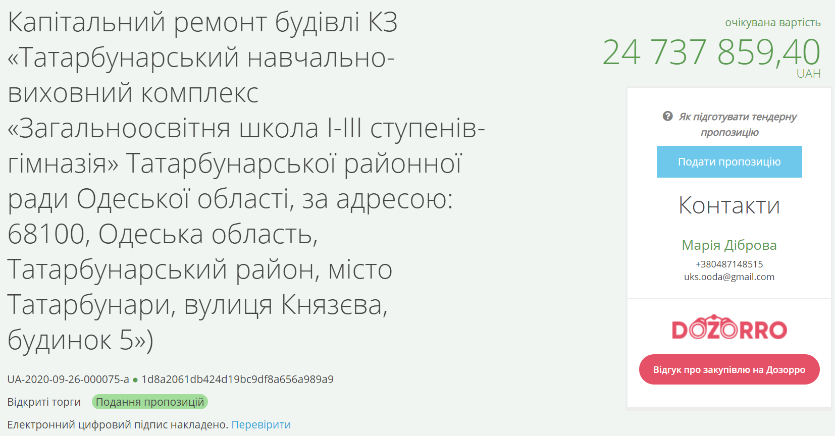 Управління капітального будівництва Одеської обласної державної адміністрації оголосило тендер для обрання підрядника, якому заплатять за капітальний ремонт будівлі КЗ «Татарбунарський навчально-виховний комплекс «Загальноосвітня школа І-ІІІ ступенів-гімназія»».