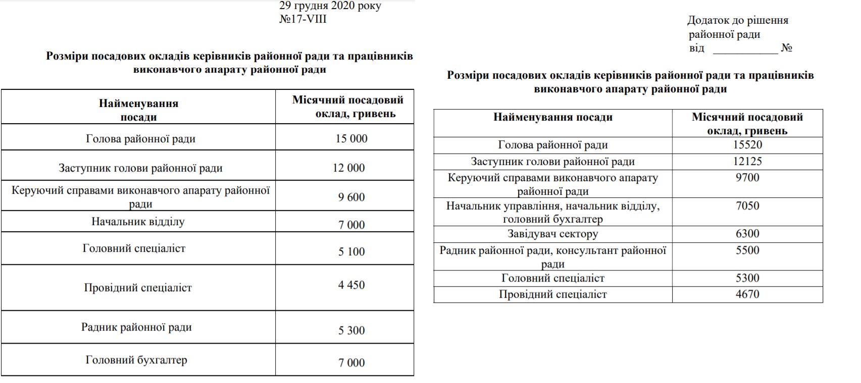 Так, якщо раніше голова райради Віталій Барвиненко отримував 15 тисяч гривень в місяць, то тепер отримуватиме 15 тисяч 520 гривень. Його заступники, що заробляли по 12 тисяч, тепер отримуватимуть на 125 гривень більше.