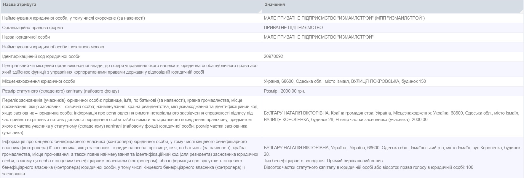 Мале приватне підприємство "Измаилстрой", згідно з даними Міністерства юстиції України, зареєстроване в 1994 році. Засновницею та бенефіціарним власником є мешканка Ізмаїлу Наталія Булгару.