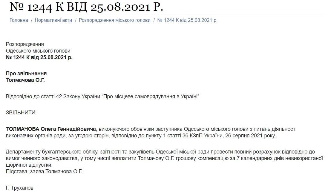 Одеський міський голова Геннадій Труханов розпорядився звільнити виконуючого обов’язки заступника Одеського міського голови з питань діяльності виконавчих органів ради Олега Толмачова
