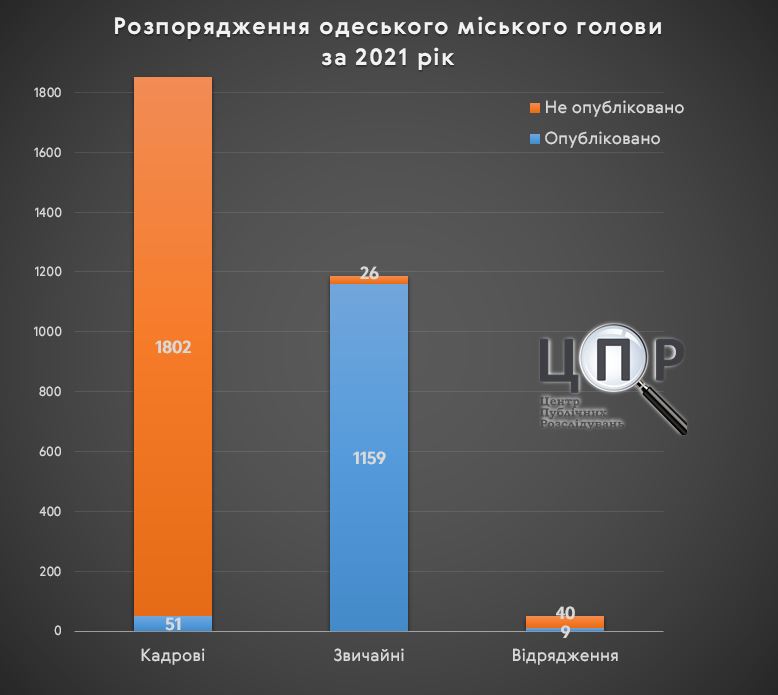 Загалом у 2021 році мер Одеси підписав понад 3 тисячі розпоряджень, більшість з них - кадрові (60%). На 8 січня (на цей момент на сайті опубліковано вже перше розпорядження 2022 року) з щонайменше 3087 (кількість розпоряджень підрахована за останнім в кожній категорії номером) підписаних розпоряджень опубліковано лише 1219. Не опубліковано щонайменше 1802 кадрових(97% від загальної кількості в цій категорії), 26 звичайних (2%) та 40 розпоряджень про відрядження (82%).