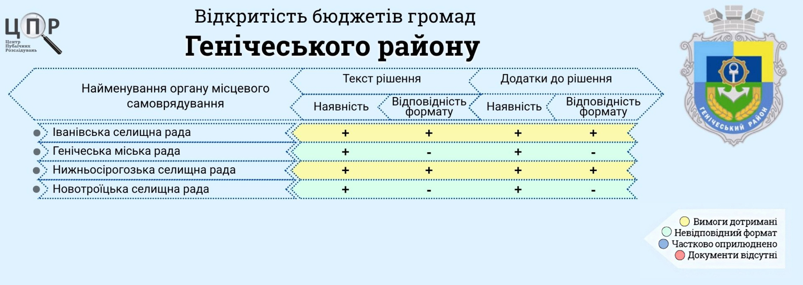 Підсумки моніторингу чотирьох громад Генічеського району чітко демонструють, що рівень відкритості розділився навпіл. Дві громади виконали вимоги повністю, забезпечивши прозорий доступ до бюджетної інформації, тоді як дві інші лише імітують публічність, розмістивши матеріали у непридатних для аналізу форматах. Тож загальний рівень відкритості у Генічеському районі становить 50 на 50.