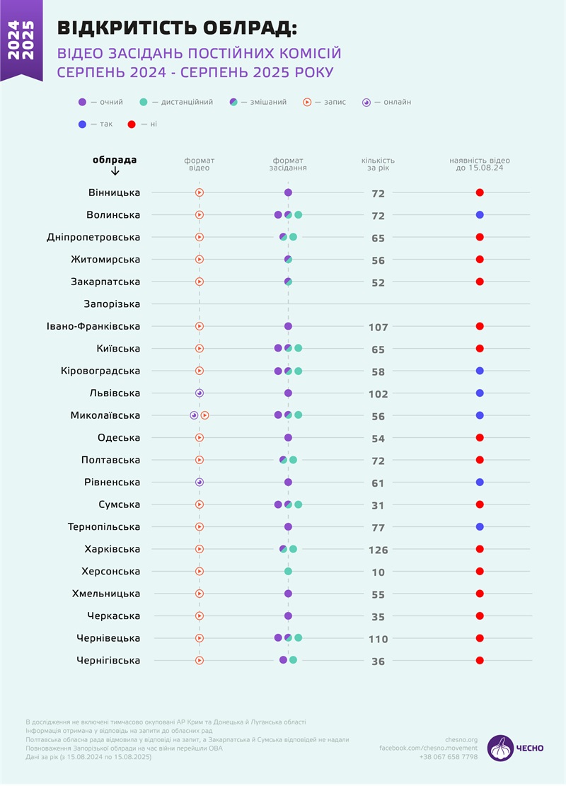 Експерти зазначили, що для більшості обласних рад трансляція сесій стала звичною справою, але Київська, Миколаївська, Черкаська та Чернівецька не оприлюднювали повні відео з пленарних засідань до середини серпня минулого року. Житомирська зробила паузу від початку повномасштабного вторгнення, але повернула відео на початку вересня 2024 року.