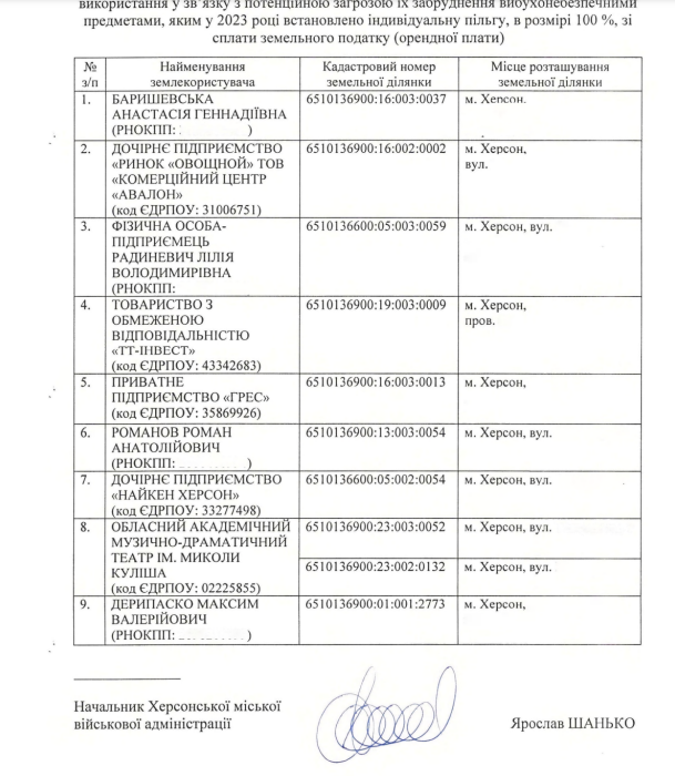 Згідно з документом, дев’ять підприємств і організацій, земельні ділянки яких визнані непридатними для використання через потенційну загрозу вибухонебезпечних предметів, звільнені від податку.