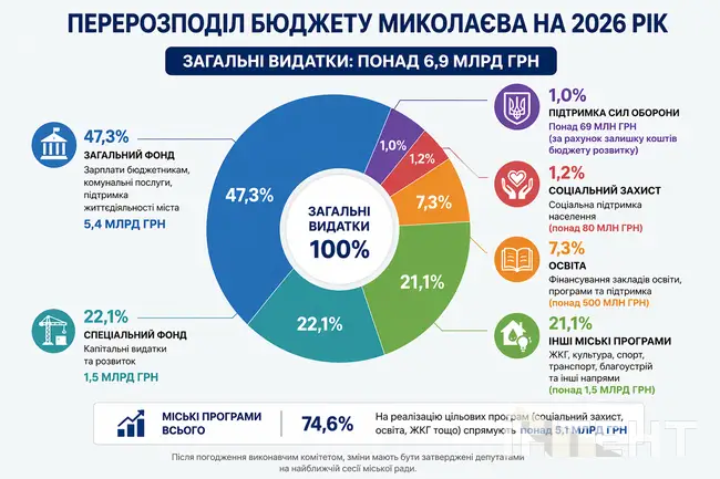 Згідно з оновленими показниками, загальні видатки бюджету становлять понад 6,9 млрд грн. Із них близько 5,4 млрд грн припадає на загальний фонд, який покриває зарплати бюджетникам, оплату комунальних послуг та підтримку життєдіяльності міста. Ще майже 1,5 млрд грн передбачено у спеціальному фонді, що спрямовується на розвиток та капітальні видатки.
