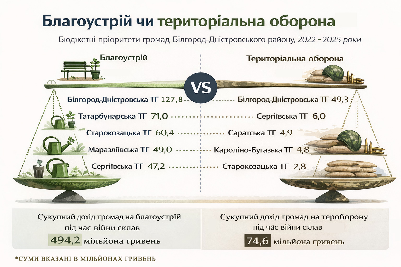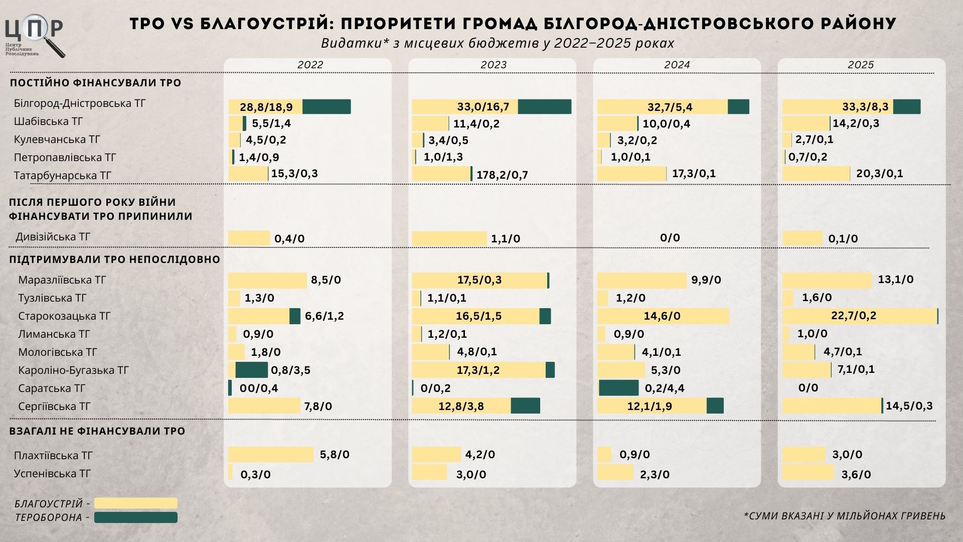 При цьому якщо виключити з розрахунків Білгород-Дністровську міську громаду, то це 25,2 мільйона гривень на ТрО проти 366,4 мільйона гривень на благоустрій. У такому разі видатки на територіальну оборону, за підрахунками аналітиків, становлять менше ніж 7% від витрат на благоустрій і лише близько 0,3% від загального обсягу видатків без урахування міської громади. У самій Білгород-Дністровській громаді видатки на заходи та роботи з територіальної оборони за 2022–2025 роки становили 2,2% від загального обсягу бюджетних видатків.