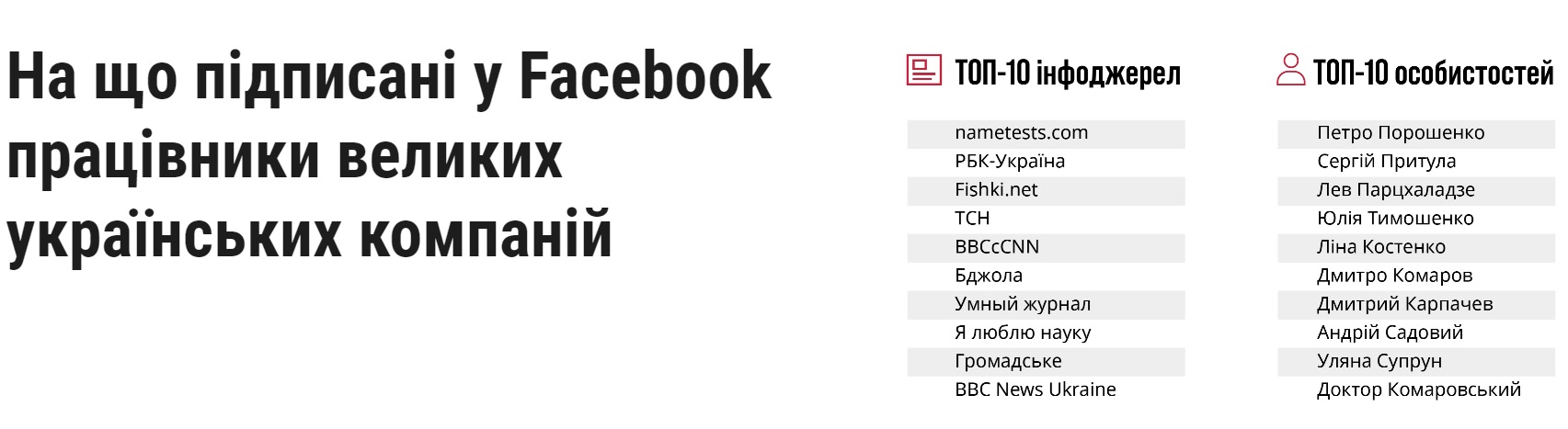 Також аналізували 93 тисячі 320 сторінок, які вподобали респонденти (одна людина, в середньому вподобала 93 сторінки). Саме вони є одним з джерел інформації, які наповнюють стрічку людей у Facebook. Дані аналізувалися за допомогою платформи SemanticForce.