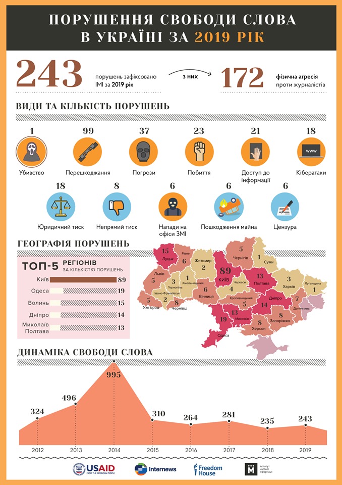 Інститут масової інформації (ІМІ) нарахував 19 випадків порушення прав журналістів в Одесі та Одеській області у 2019 році, що ставить Одесу на друге місце в ТОП-5 за цим критерієм.