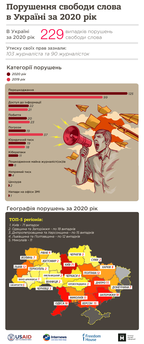 У 2020 році на цілих 26% зросла кількість перешкоджань законній професійній діяльності журналістів порівняно з 2019 роком. Основними причинами такого зростання стали протизаконні карантинні обмеження та місцеві вибори.