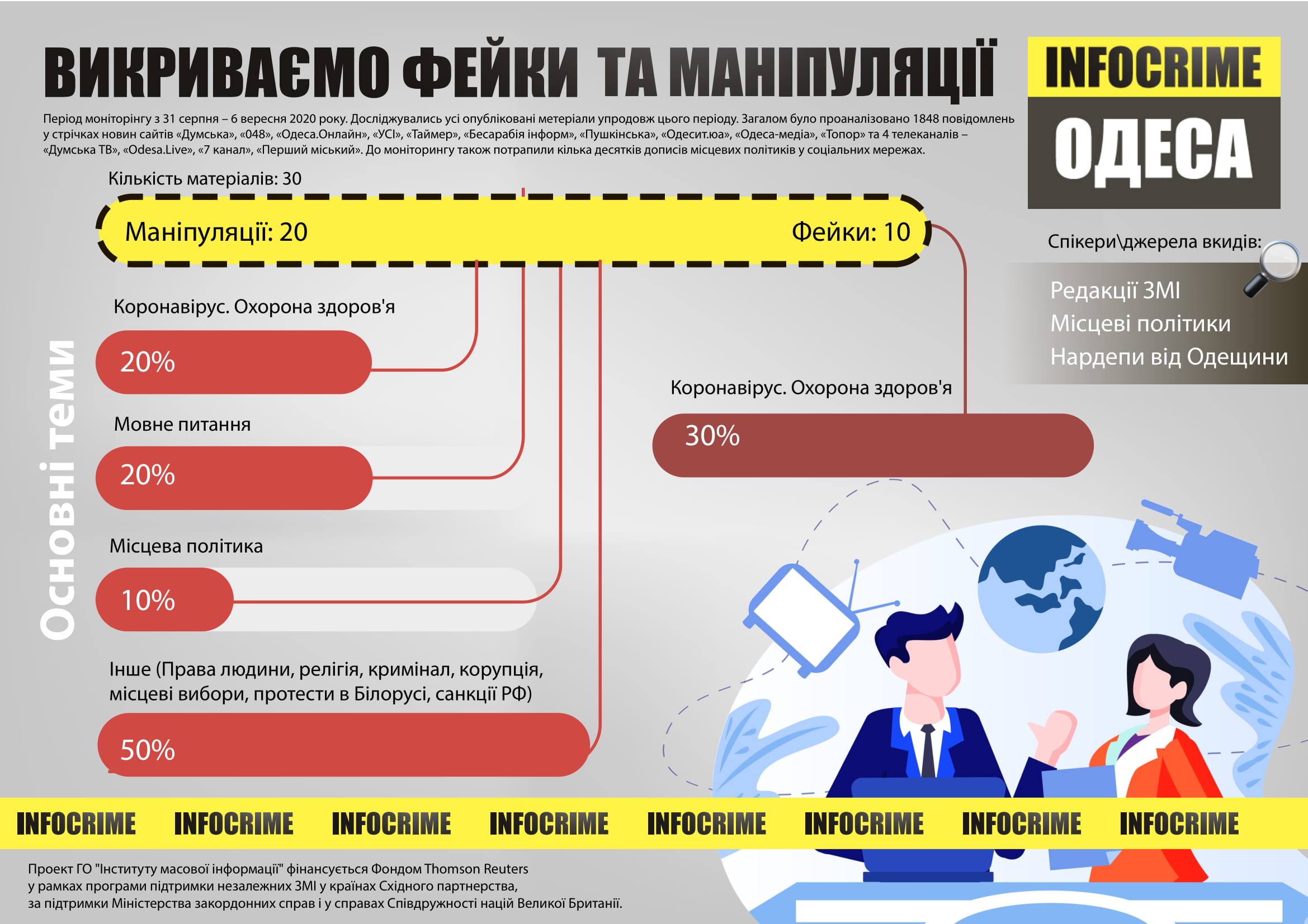 Маніпуляції в одеських медіа поширювали зазвичай самі журналісти. Більшість з них стосувалися невідповідності назви новини її змісту, перебільшень, оцінок, які подавалася як фактаж, та політичної джинси. Серед основних тем можна виокремити коронавірусну інфекцію, місцеву політику та мовне питання.