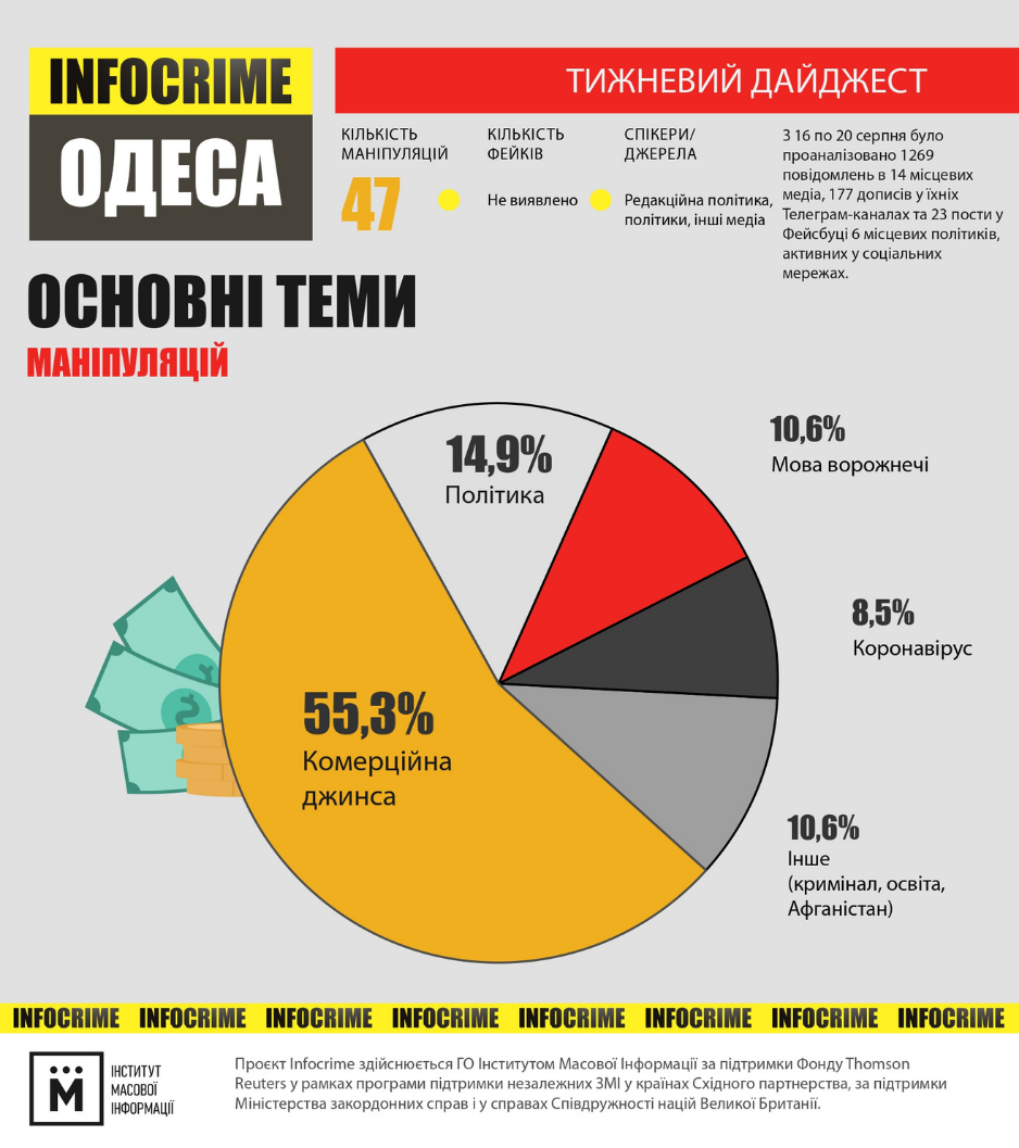 За даними "Infocrime Одеса", аналітики 16 по 20 серпня проаналізували 1 тис. 269 повідомлень в 14 місцевих медіа, 177 дописів у їхніх Телеграм-каналах та 23 пости у Фейсбуці 6 місцевих політиків, активних у соціальних мережах. В 47 матеріалах (3.2% від усіх проаналізованих) виявлені маніпуляції. З них 64 % відносяться саме до "комерційної та політичної джинси".