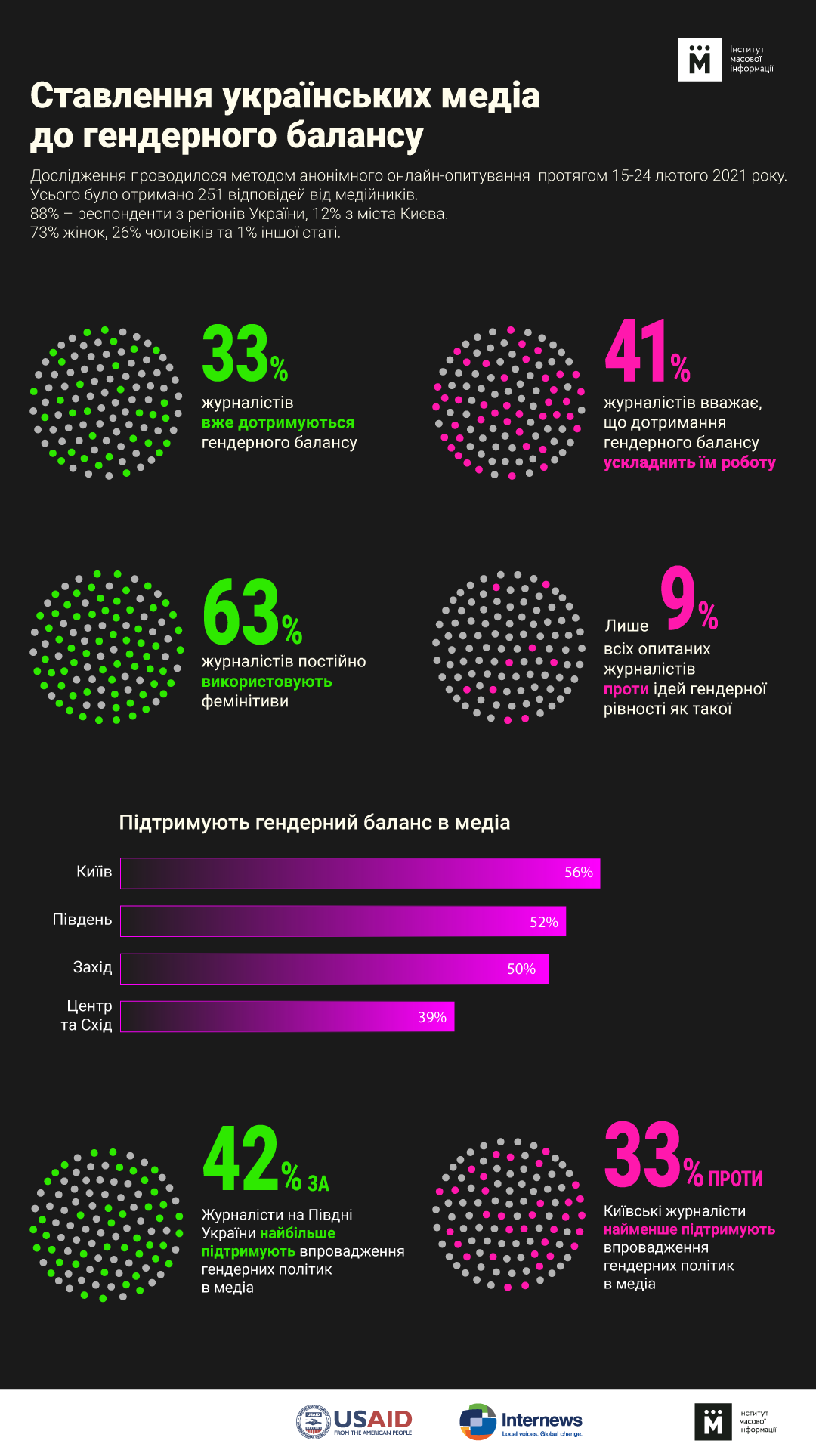 Втім, 40% сказали, що він важливий тільки в окремих випадках. А 9% опитаних ІМІ медійників висловилися проти дотримання гендерного балансу в медіа.