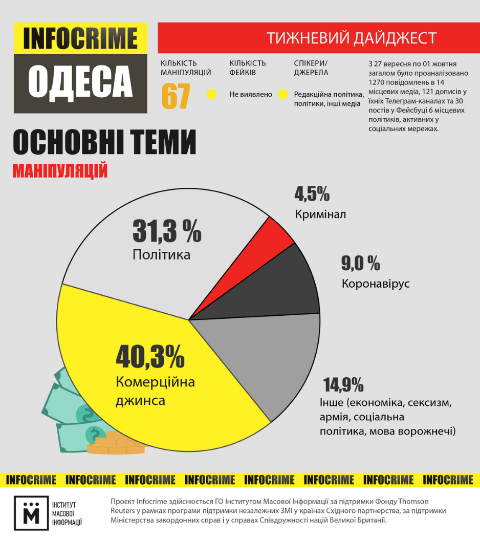 З 27 вересня по 01 жовтня загалом було проаналізовано 1270 повідомлень в 14 місцевих медіа, 121 дописів у їхніх Telegram-каналах та 30 постів у Facebook 6 місцевих політиків, активних у соціальних мережах. В 67 матеріалах (4.7 % від усіх проаналізованих) виявлені маніпуляції. З них 58% відносяться саме до комерційної та політичної джинси.