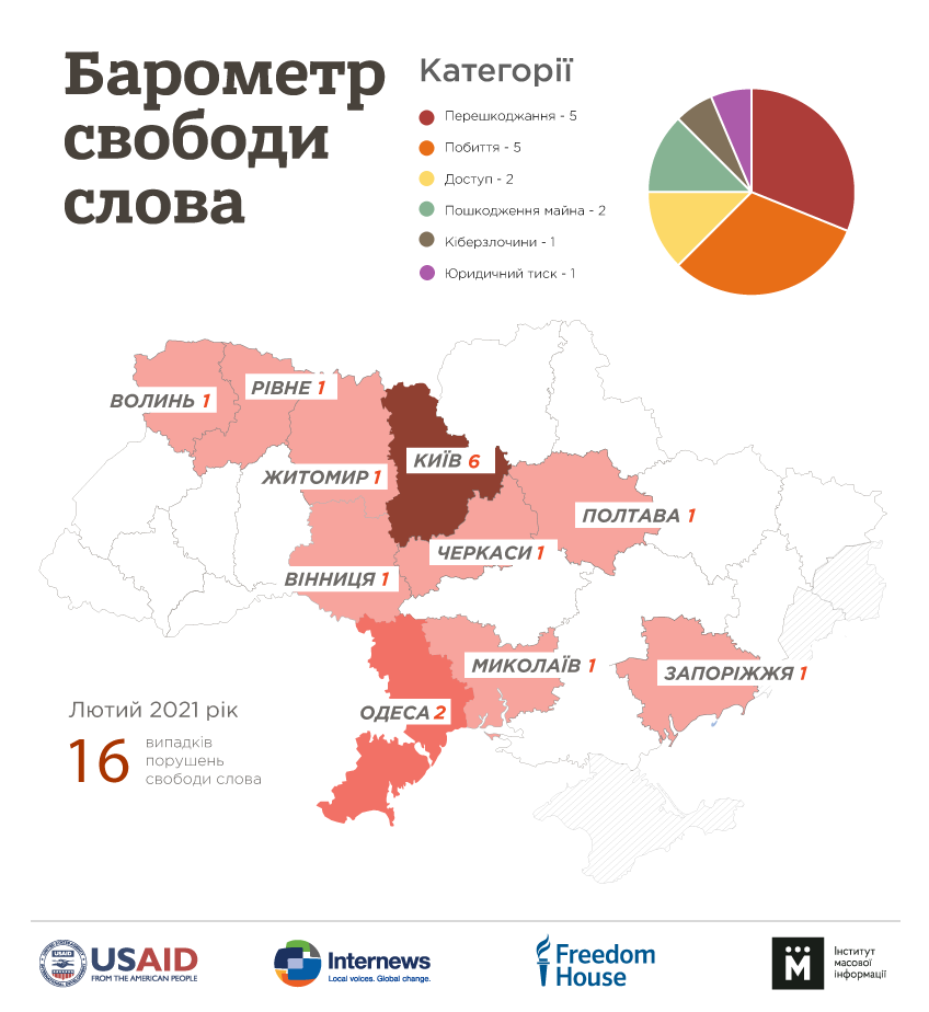 П’ять українських журналістів отримали тілесні ушкодження, а загалом експерти Інституту масової інформації зафіксували 16 випадків порушень свободи слова в Україні в лютому.