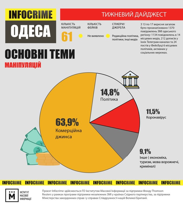 З 13 по 17 вересня загалом було проаналізовано 1370 повідомлень ЗМІ Одеського регіону: 1134 повідомлень в 14 місцевих медіа, 212 дописів у їхніх Telegram-каналах та 24 постів у Facebook 6 місцевих політиків, активних у соціальних мережах. Маніпуляції та порушення стандарту достовірності виявлені у 61 матеріалі (4.4 % від усіх проаналізованих). З них 78,6 % відносяться саме до комерційної та політичної "джинси".