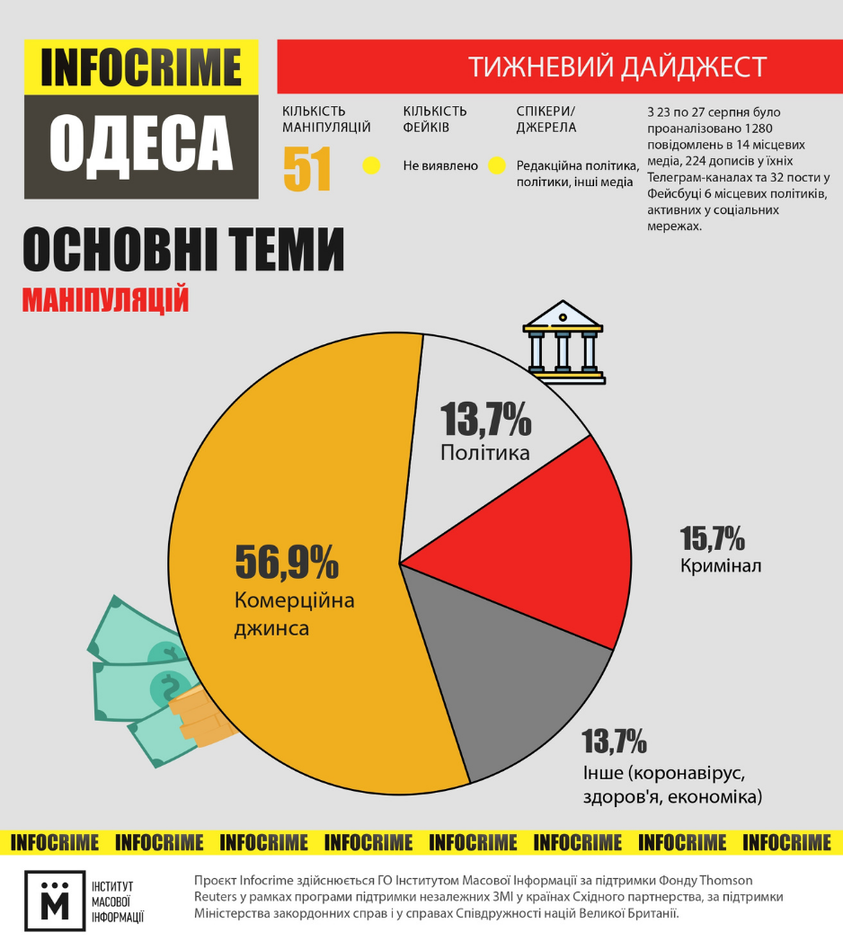 *Дослідження охопило період з 23 по 27 серпня 2021 року. Загалом було проаналізовано 1536 повідомлення в стрічках новин та Телеграм каналах 10 медіа «Думська», «048», «Одеса.Онлайн», «УСІ», «Таймер», «Бессарабія інформ», «Пушкінська», «Одесит.юа», «Одеса-медіа», «Топор» та 4 телеканалів (підсумкові випуски за тиждень) – «Думська ТВ», «Odesa.Live», «7 канал», «Перший міський». До моніторингу також потрапили 32 дописи у Фейсбуці 6 місцевих політиків.