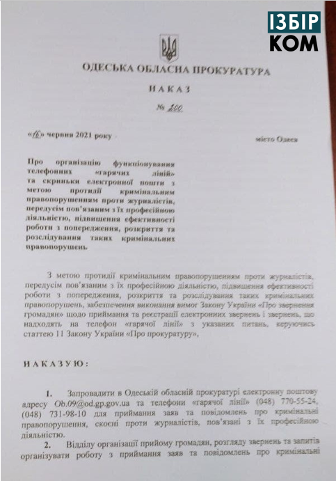 Крім того, видано наказ щодо телефону гарячої лінії для журналістів задля повідомлень про кримінальні порушення, пов'язані з їх професійною діяльністю.