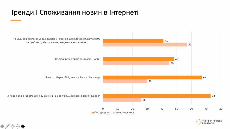 Цікавими виявилися дані щодо уявлення респондентів про якісні та незалежні медіа, а також про власне споживання новин в інтернеті. Наприклад, майже половина респондентів читає лише заголовки новин, але при цьому 73% опитаних заявляють, що перевіряють новини з телебачення та соцмереж в інших джерелах інформації.