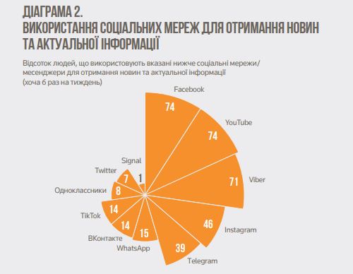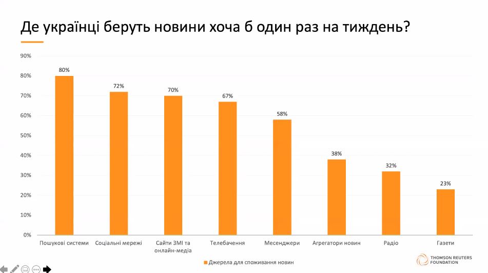 Також дані дослідження в Україні свідчать, що два найпопулярніші джерела інформації в Україні — пошукові системи та соціальні медіа, які потіснили телебачення. Щотижня 80% опитуваних використовують пошукові системи, а 72% — соціальні мережі або інформаційні онлайн-видання (70%). Двоє з трьох респондентів (67%) переглядають телевізійні програми щонайменше раз на тиждень. Лише третина (32%) слухає новини по радіо, а ще менше читає газети (23%).