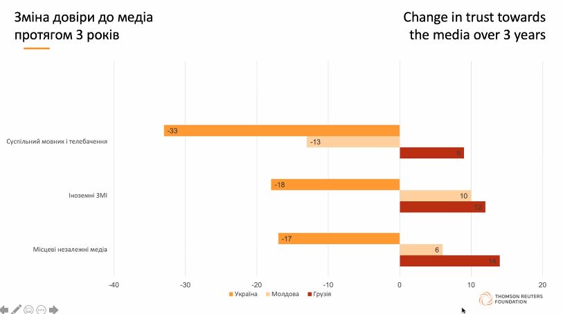 Наприклад, респонденти в Молдові та Грузії кажуть, що за останні три роки (за власним переконанням) довіра до місцевих, загальнонаціональних та іноземних медіа зростає. В той же час в Україні, за даними дослідження, довіра до всіх цих медіа зменшується. Найбільше втрачають довіру саме загальнонаціональні медіа. Лише 11% людей повністю довіряє ЗМІ.