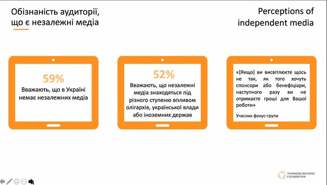 Також, за результатами дослідження, троє з п’яти опитаних (59%) вважають, що в Україні немає незалежних ЗМІ — частково тому, що, на їхню думку, багато видань контролюються та фінансуються державою, іноземними урядами чи олігархами, а журналісти просувають інтереси тих, хто їх фінансує.