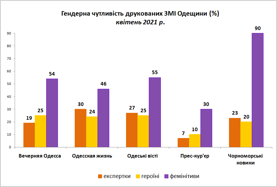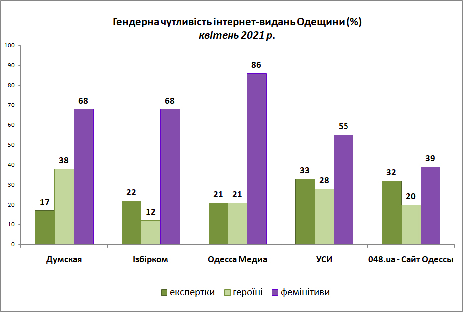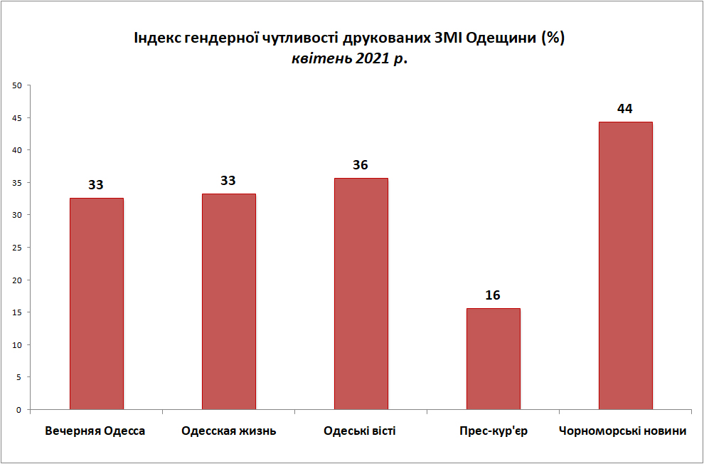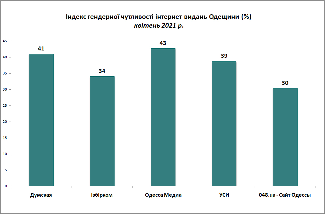 Індекс гендерної чутливості, який складається з кількості експерток, героїнь та фемінітивів, найвищий, за результатами квітневого моніторингу, у сайту «Одесса-Медиа» - 43%. На наступних позиціях - «Думская» - 41% та «УСИ» - 39%. Серед друкованих ЗМІ найбільш гендерночутливою є газета «Чорноморські новини» - 44%.