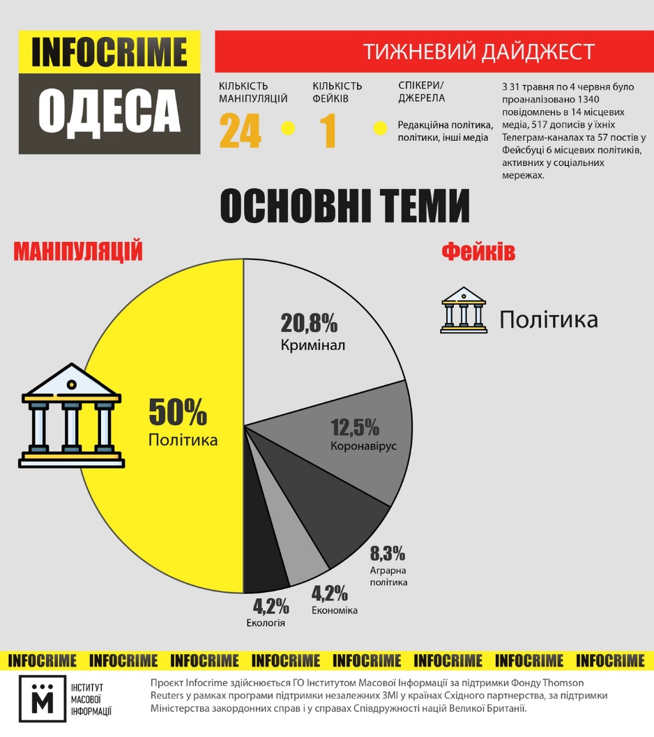 Нагадаємо, команда проєкту Іnfocrime Одеса у травні презентувала результати щотижневого моніторингу одеського інформаційного простору, основним висновком якого вважає те, що навіть у міжвиборчий період одеські політики та провідні регіональні ЗМІ маніпулюють переважно на політичні теми.