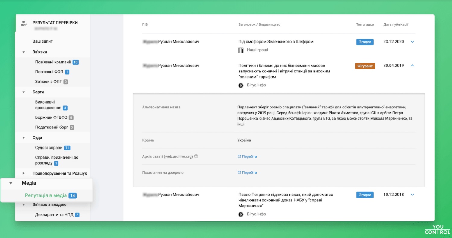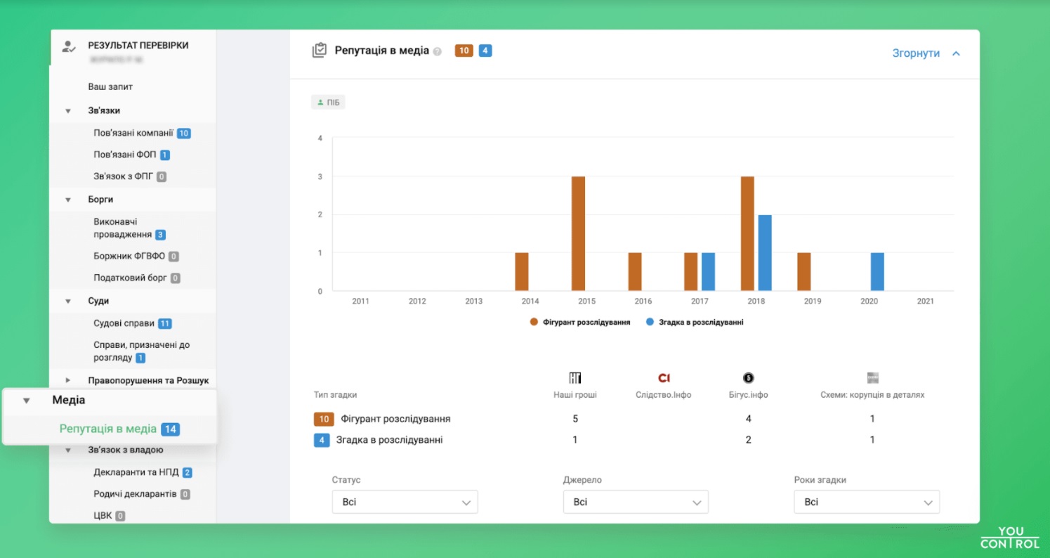 Команда сервісу YouControl зібрала розслідування за 10 останніх років з чотирьох організацій, що проводять антикорупційні розслідування та створила інструмент "Репутація в медіа".