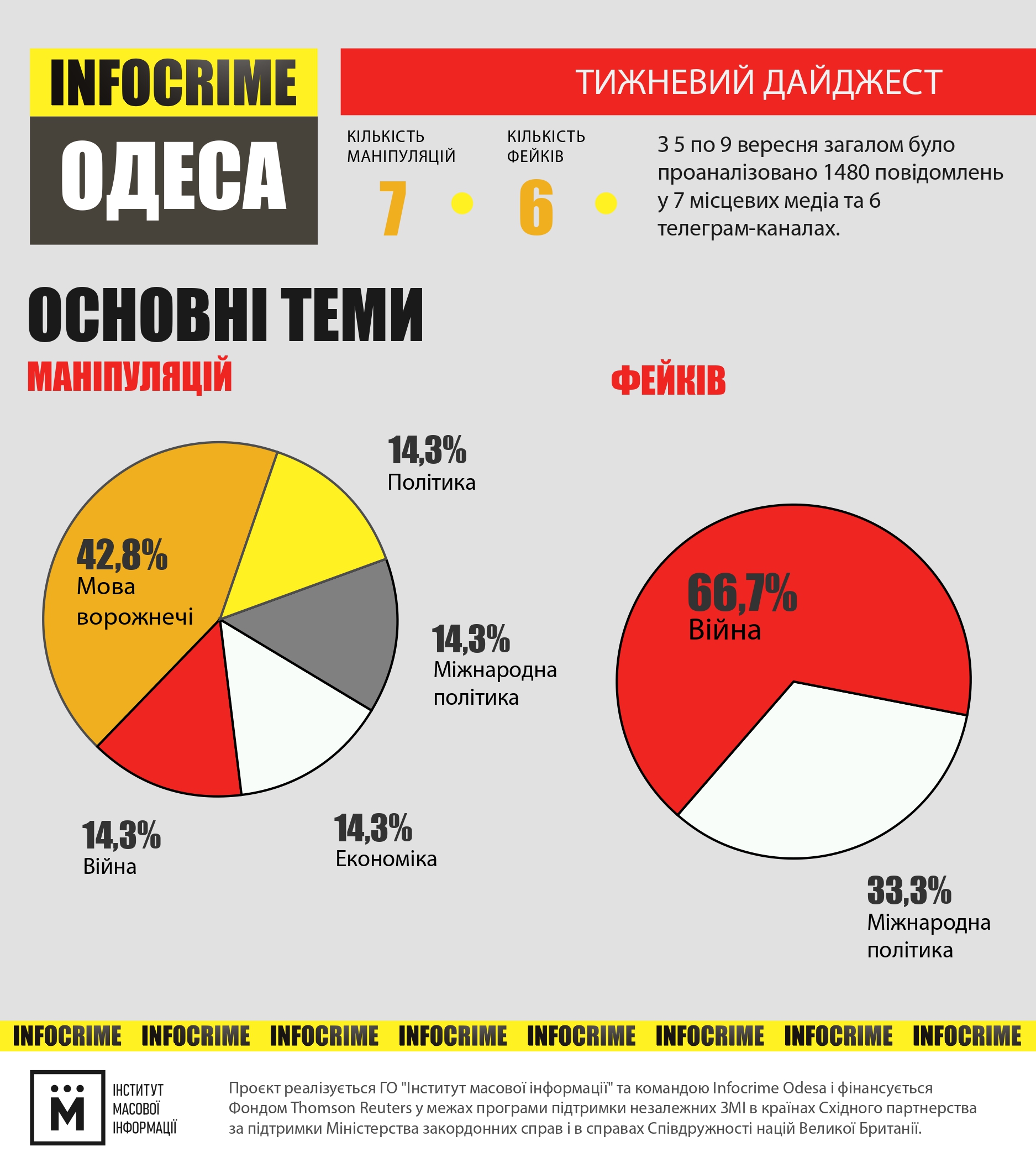 З 5 по 9 вересня аналітики загалом проаналізували 1 тисячу 480 повідомлень у семи місцевих медіа та шести телеграм-каналах. Також до моніторингу потрапили основні пропагандистські фейки та наративи російських медіа про Одещину. Експерти виявили у 13 матеріалах (1%) ознаки, за їхніми оцінками, інформаційних маніпуляцій. З них шість представляють собою повідомлення з елементами фейків та російської пропаганди.