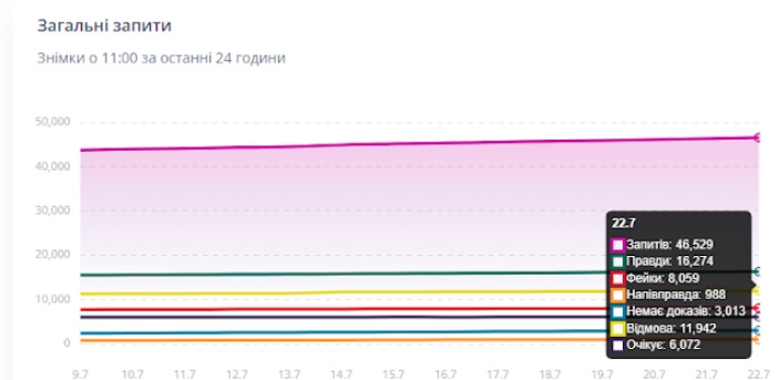 За весь час роботи бота його користувачі надіслали понад 47 тисяч запитів: новин, фото, відео українською та англійською. З цих запитів 8 тисяч виявилися фейками.