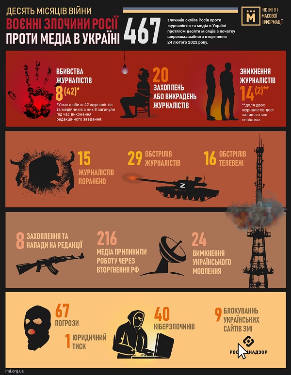 Серед російських злочинів на українській території, які зареєстрували експерти ІМІ, вбивства, викрадення, обстріли та поранення журналістів, кіберзлочини, обстріли телевеж, погрози, напади на редакції медіа, кіберзлочини, вимкнення українського мовлення, а також присвоєння бренду і створення фейкових клонів місцевих видань та каналів для поширення російської агресивної пропаганди.