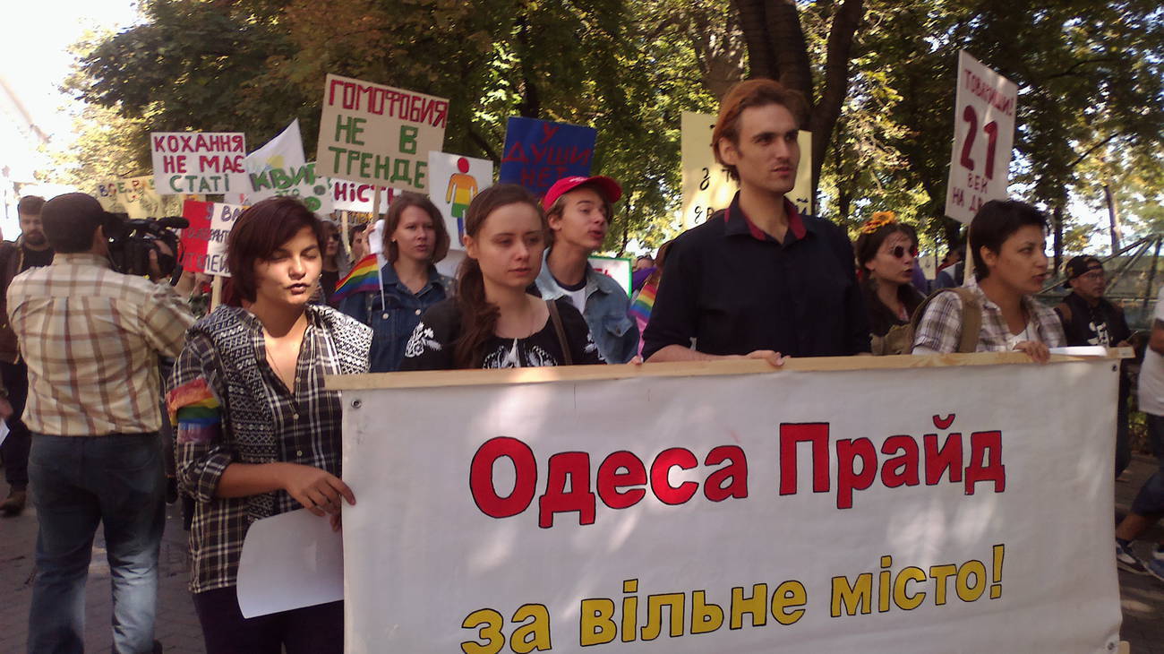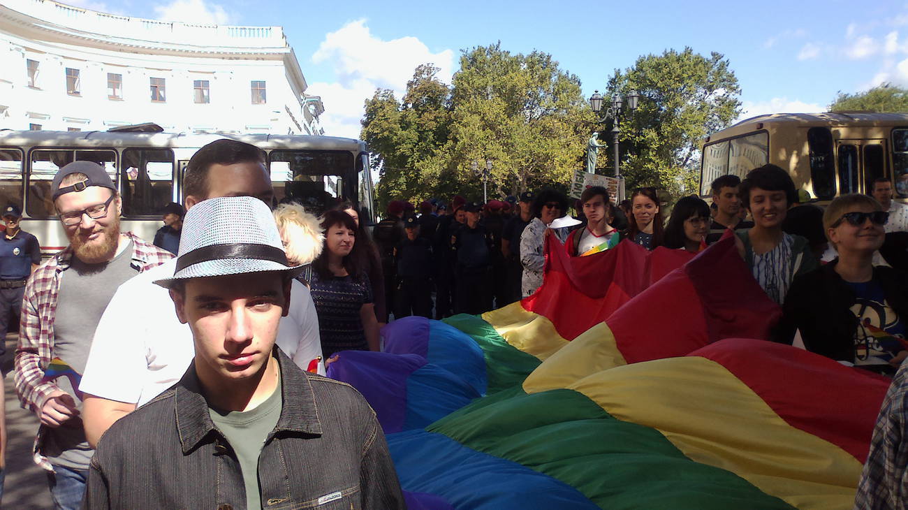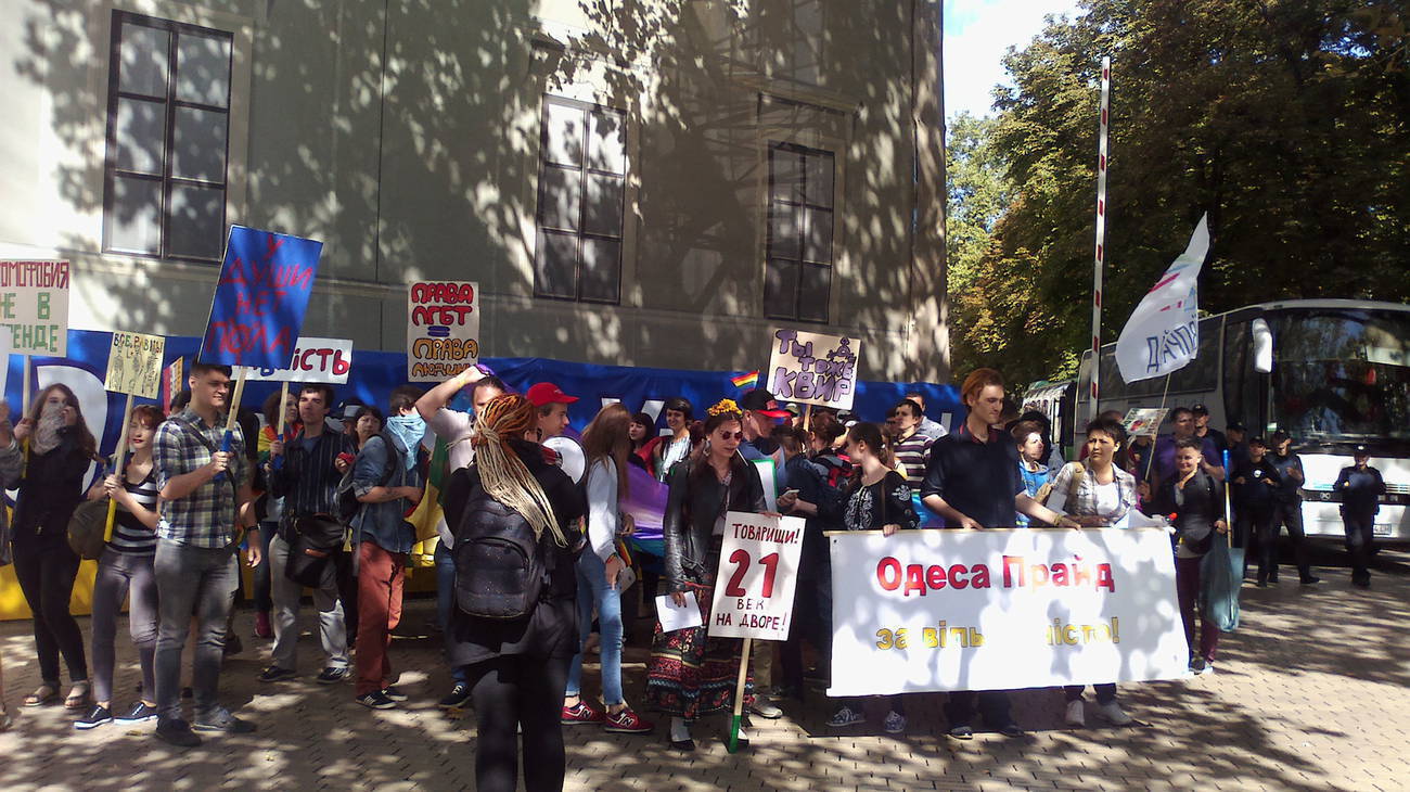 Позже около 100-150 участников марша с лозунгами о правах человека прошли до здания мэрии, скандируя: "Права людини - понад усе", "Гей - це ОКей", "Одеса - вільне місто".