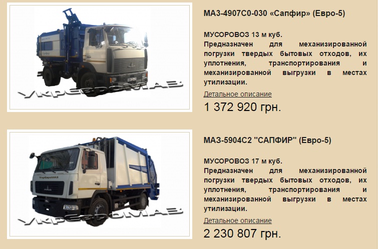 Примечательно, что согласно сайту компании УкрЕвроМАЗ мусоровозы на шасси МАЗ, например МАЗ-5904С2 «САПФИР» (Евро-5) можно приобрести за 2 миллиона 230 тысяч гривень.