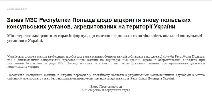 Украинская сторона приняла необходимые меры для обеспечения безопасности как сотрудников зарубежной службы Республики Польша, так и дипломатических консульских представительств Польши на територии этой страны