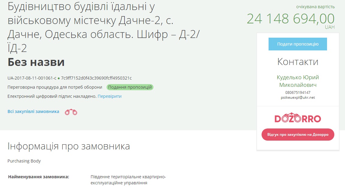 За строительство столовой военного городка в Одесской области предлагают 24 миллиона гривень