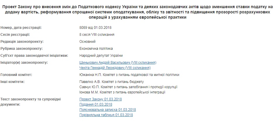 Двое народных депутатов Андрей Шинькович и Геннадий Чекита зарегистрировали в Верховное Раду проект закона о внесении изменений в Налоговый кодекс Украины и некоторые законодательные акты