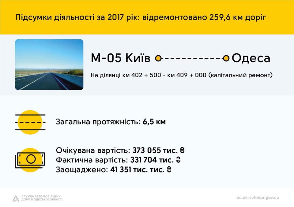 Наибольший объем ремонтов осуществлен на дороге М-15 (Одесса-Рени). Здесь за прошлый год отремонтировано 138,9 км на 1,69 млрд грн (еще 56,4 км отремонтированы в 2016 году). Кроме того, ремонт еще 94 км (сметная стоимость 1,53 млрд грн) дороги запланирован на этот год.
