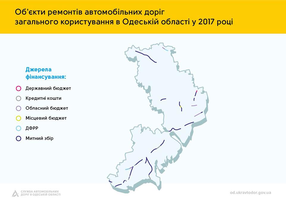 В 2017 году в Одесской области отремонтированы 145,4 км дорог общего пользования международного значения (на 212% больше, чем в 2016 году) и 114,2 км дорог государственного и местного значения (на 194% больше, чем за предыдущий год).