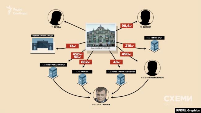 Как установили журналисты, значительными площадями в памятнике архитектуры - доме Руссова - владеют юридические и физические лица, связанные с одесским бизнесменом-застройщиком Русланом Тарпаном.
