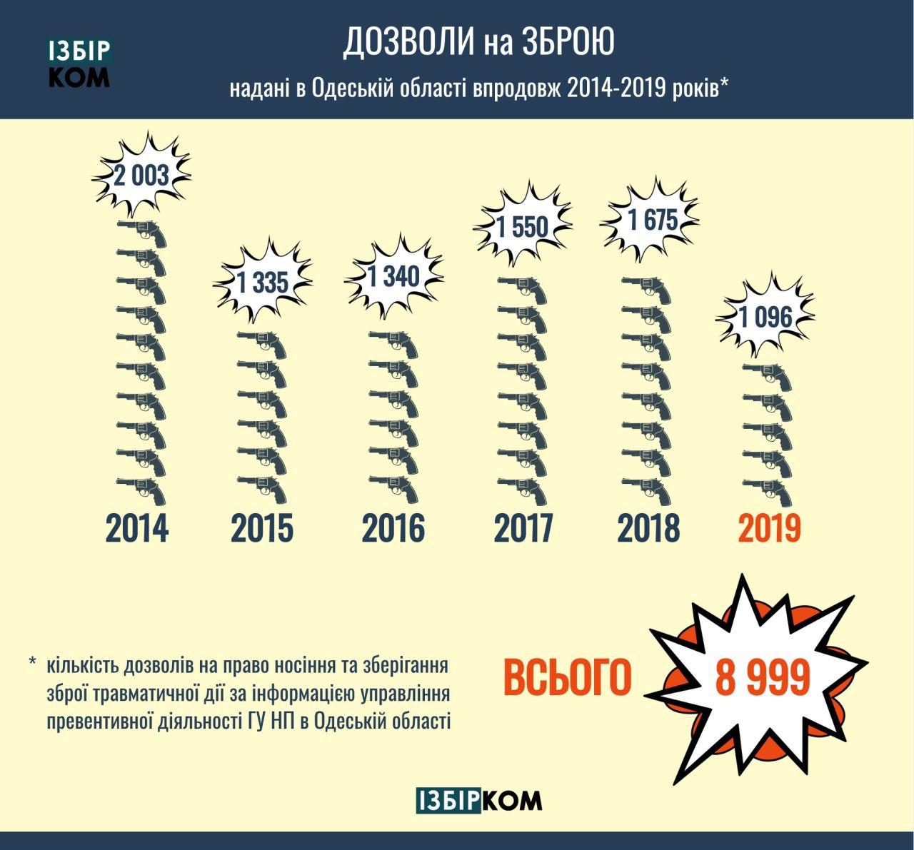 У 2014 році жителі Одеської області оформили понад 2 тисячі дозволів на право носіння травматичної зброї, проте потім кількість дозволів різко скоротилася.